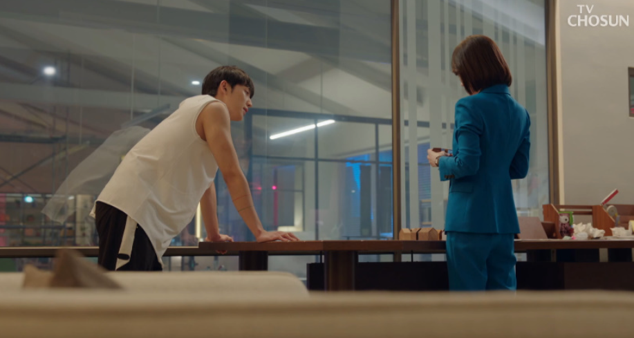 중요한 발표를 앞두고 멘탈이 흔들린 재원은 디자인 총괄팀장을 불러 자신 대신 발표를 하도록 준비를 시킵니다. 오랜 지인이기도 한 디자인 팀장 테오는 재원을 걱정해주는데 재원은 얘써 괜찮은척 합니다.