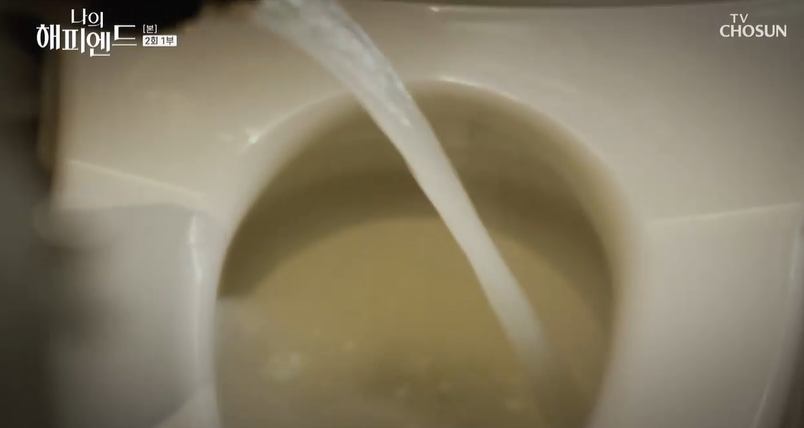 사골 국물을 전달받은 재원은 인사치레로 새아빠에게 고맙다며 전화를 하고는 사골국물을 변기에 버려버립니다.