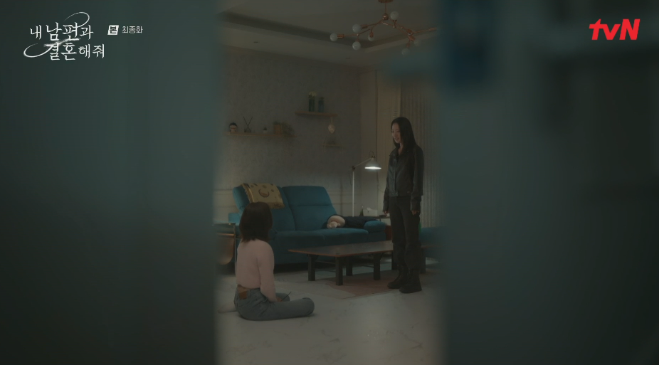 집 뒷정리를 하다가 갑자기 벨이 울려서 나가봤지만 문앞에 아무도 없는 상황. 문을 닫으려는 순간 갑자기 나타난 수민이 전기 충격기를 이용해 지원을 기절시킵니다.