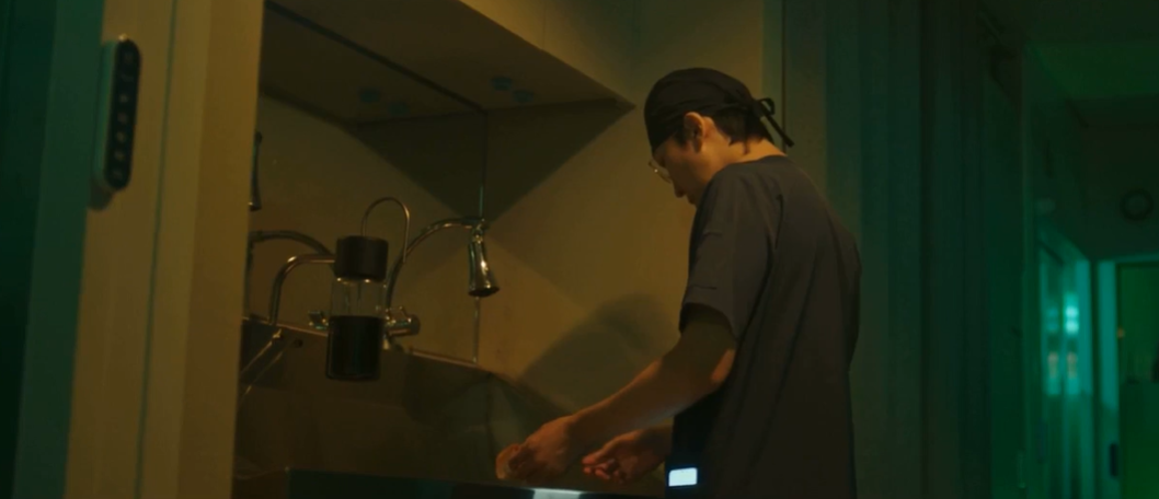 화려했던 모습은 간데없고 어둑한 병원에서 어색한 정우. 처치 도구를 챙겨와 하늘의 상처를 치료해 줍니다.