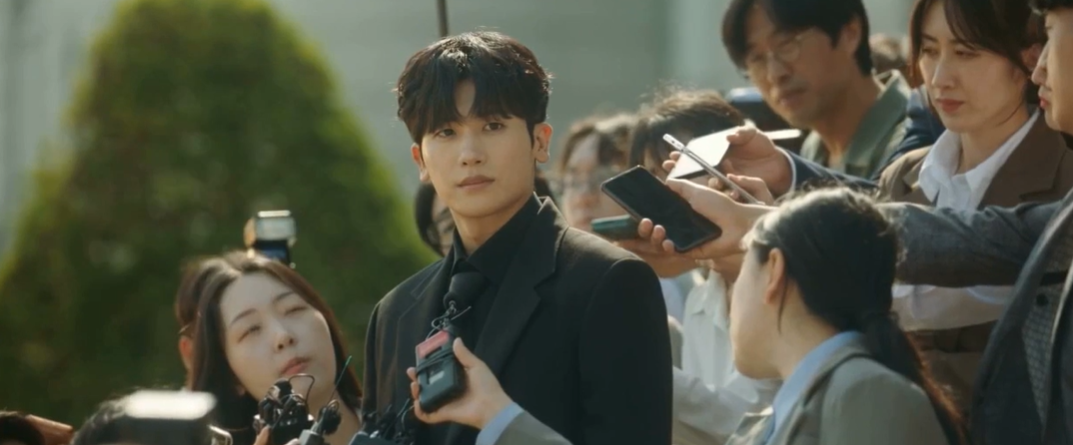 재판후 기자들에게 둘러쌓인 정우와 그런 정우를 안타깝게 바라보는 하늘.