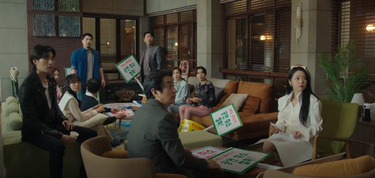 단원들은 이사장의 횡포에 반발하며 시위를 준비하고 있는데 이를 막아선 차세음.