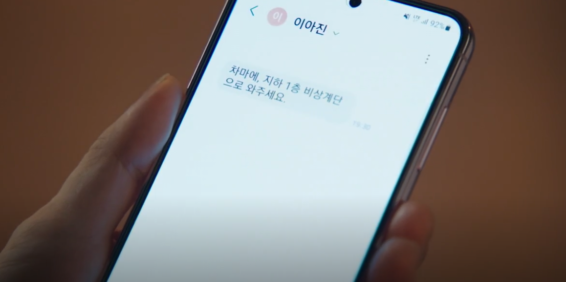 유정재에게 한방 먹이고 돌아서는데 단원 이아진에게 문자를 받고 의아해 하면서도 차마에는 비상계단을 찾아갑니다.