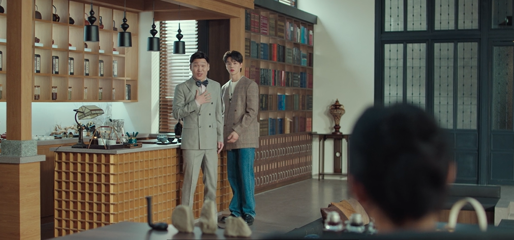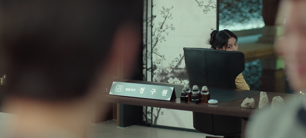 도희 앞에서 억지 웃음을 짓는 구원과 황급히 자리를 피하는 박실장.