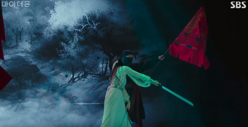 아직 사태의 심각성을 모르는 구원은 박실장에게 cctv를 돌려봐 달라고 부탁하고, 이후 진스타의 최종 리허설 무대 점검을 참관합니다. 진스타의 검무를 보면서 인간 시절에 대한 꿈에 반복적으로 나오는 검무를 추는 여인을 떠올리는 구원.