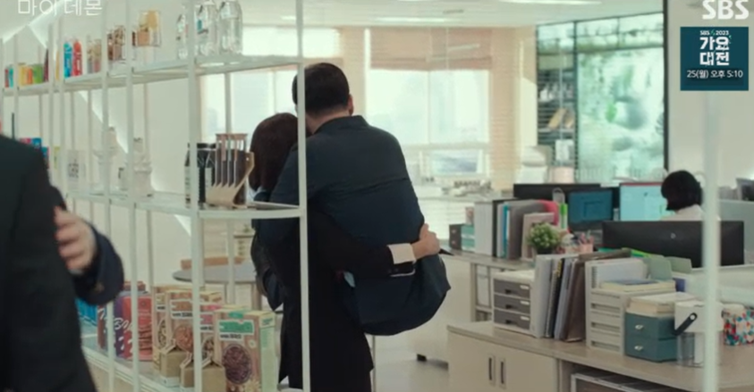 사무실에서 구원이 무사하게 복귀한 것을 축하하며 폭죽을 쏘자 놀라서 신비서에게 안겨버린 박복규.
