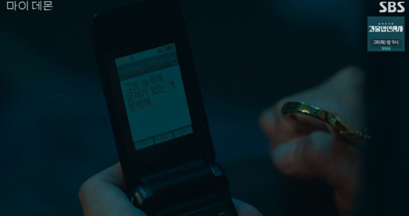정구원이 도희와 헤어진 후 주저앉는 모습을 본 노도경은 데몬 구원이 자신을 찾아올까봐 불안증세를 보이며 숨어있는 기광철에게 안심하라는 듯 문자를 보내줍니다.