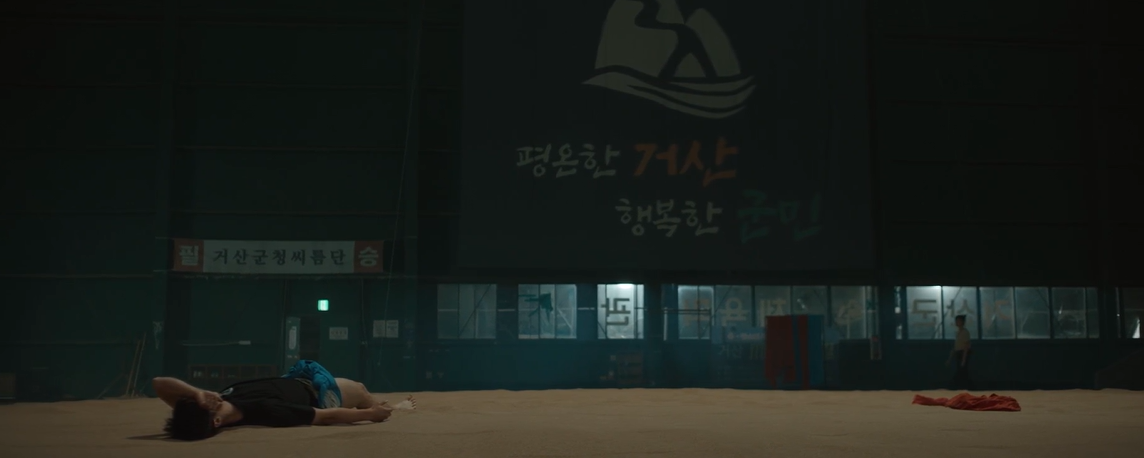 백두는 씨름 그만두게 된것에 대해 미안하다며 씨름장에 두러누워서 일어나지 않은채 이야기 합니다.