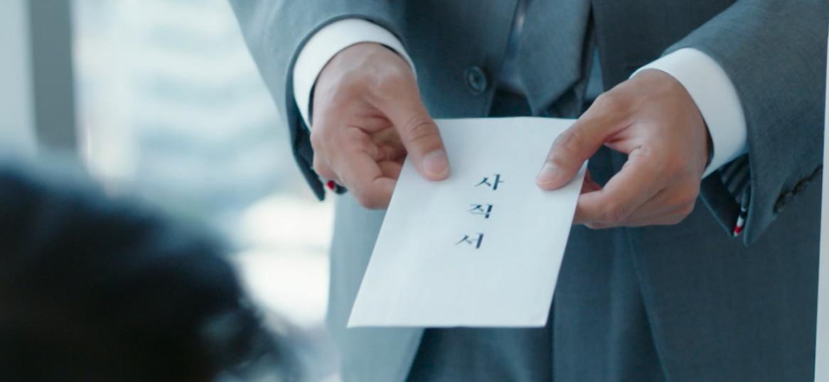 출근하는 이대표에게 싸인한 계약해지서를 건내는 란주. 서목하가 그렇게 대단하냐는