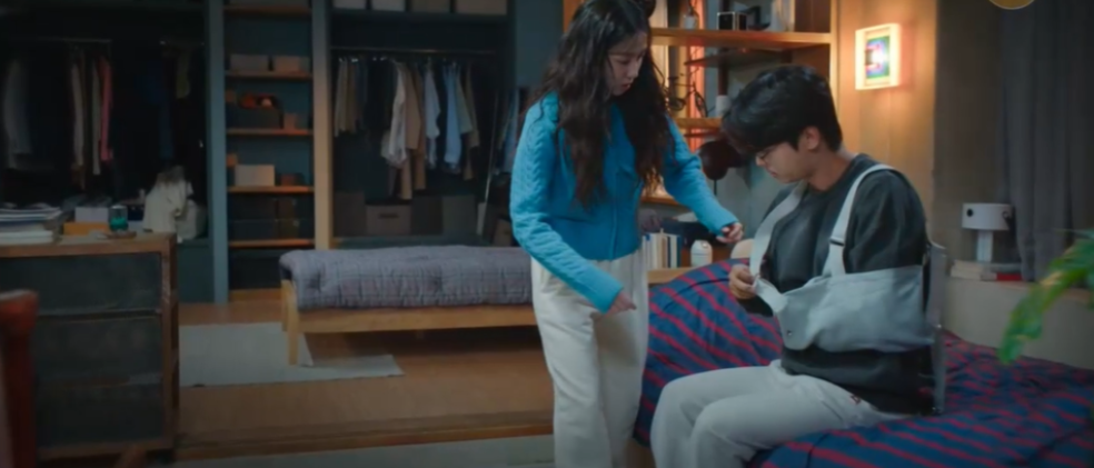 집으로 돌아온 목하는 어깨에 맨 깁스를 고쳐매려는 우학을 도와주면서 우학 없었으면 다칠뻔 했다며 고맙다고 말합니다.
