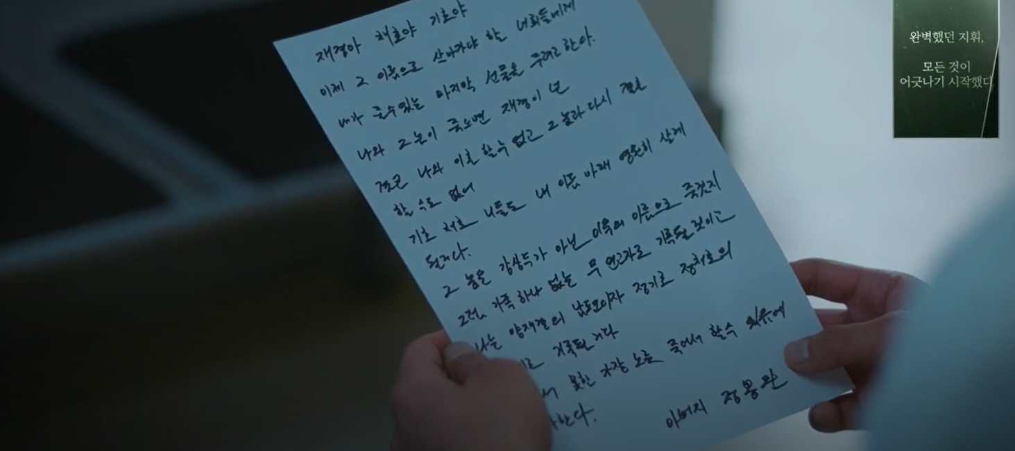 그 시각 상두를 칼로 찌른 봉완도 집에서 혼자 죽음을 준비합니다. 끝까지 가족들에게는 도움안되는 유서를 남기고 자살한봉완은 체포하러 갔던 경찰에 의해 발견됩니다.