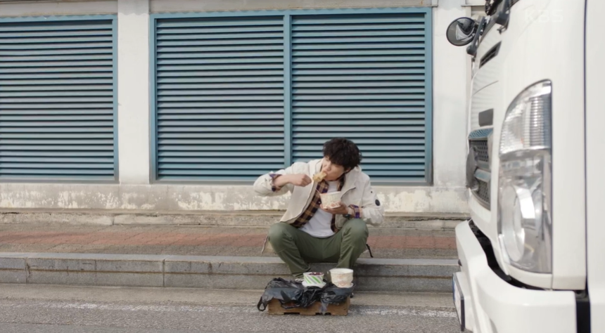 공진단과 도라, 감독은 함께 식사를 하고 필승은 도라를 피해 차옆에소 혼자 사온 떡볶이로 식사를 합니다.