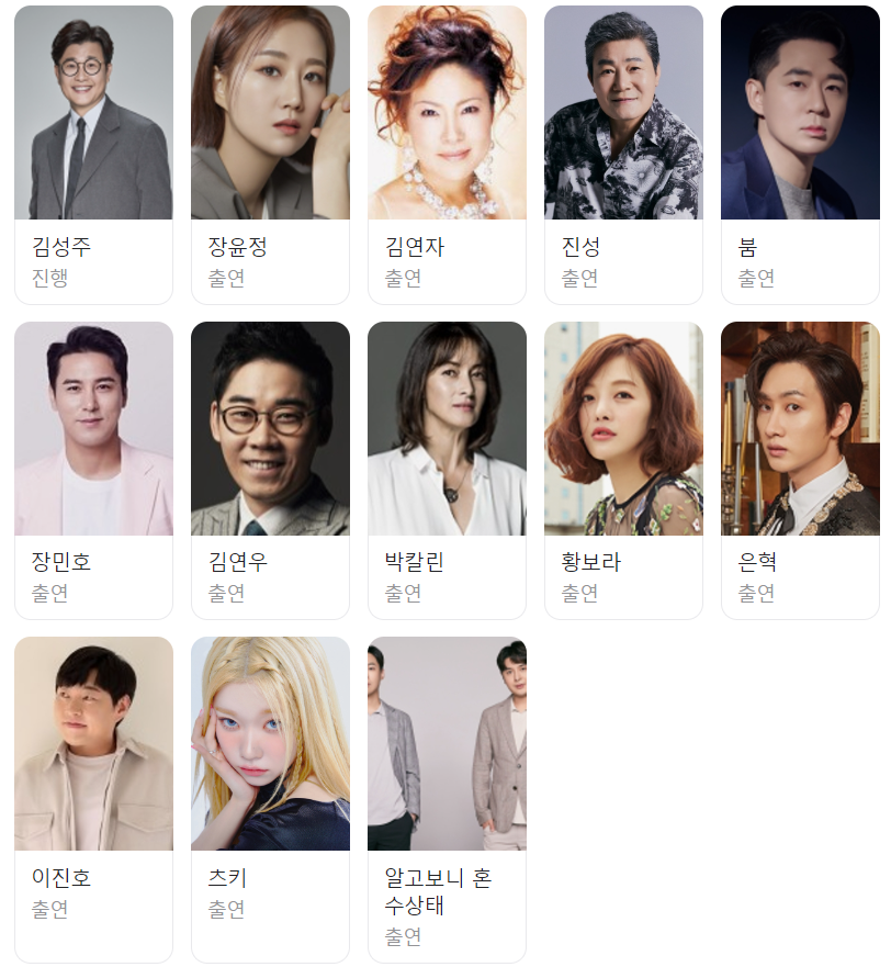 | 출연자 | 장윤정, 김연자, 진성, 붐, 장민호, 김연우, 박칼린, 황보라, 은혁, 이진호, 츠키, 알고보니 혼수상태, 안성훈, 박지현 |