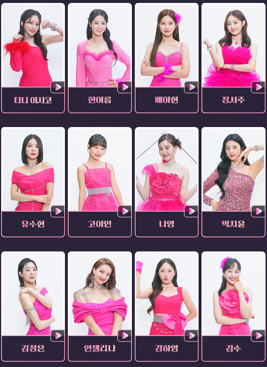 강지수, 강하영, 고아인, 고유선, 곽지은, 구민서, 권민정, 권연서, 길건, 김다율, 김 메이다니, 김민선, 김벼리, 김보민, 김소연A, 김소연B, 김수, 김예은, 김정은, 김청아, 나영, 노규리, 노수영, 라라 베니또 리나, 명재이, 미스김, 민정윤, 박민주, 박지윤, 방서희, 배아현, 복지은, 빈예서, 송자영, 수빙수, 슬기, 신수지, 안젤리나, 양서윤, 양송희, 엄유정, 염유리, 오승하, 오유진, 유수정, 유수현, 윤서령, 윤소양, 이수연, 이시현, 이신주, 이예은, 이하리, 이하정, 정서주, 정슬, 조수빈, 진혜언, 지나유, 채수현, 천건예, 채윤, 천가연, 최향, 최예지, 풍금, 한소민, 타니 아사코, 한수정, 한여름, 화연