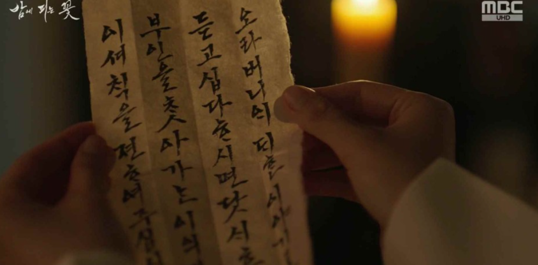 윤학이 가고난 후 자신의 방에서 만나면 좋은 벗이란 책과 함께 서찰을 발견한 여화. 오라버니에 대한 소식을 듣고 싶거든 닷새후 부인을 찾는 이에게 이 서책을 전해주라는 내용입니다.
