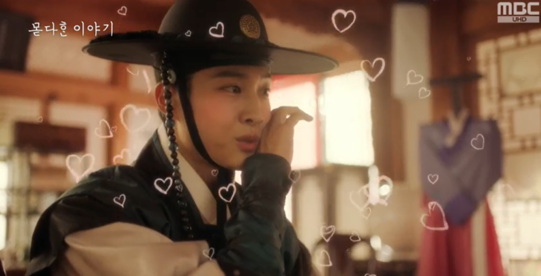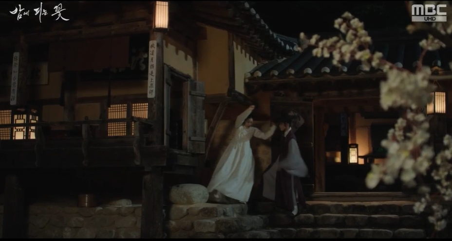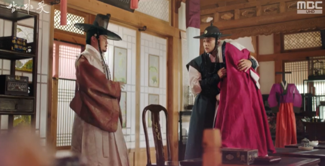 갑자기 대행수를 만나러 요섭이 들어오자 여화가 신분을 들킬까봐 수호는 여화를 안아 가려주고, 요섭은 여화가 수호의 정인이라고 생각하고는 둘만의 시간을 방해했다는 생각에 서둘러 사과를 하고 나갑니다.