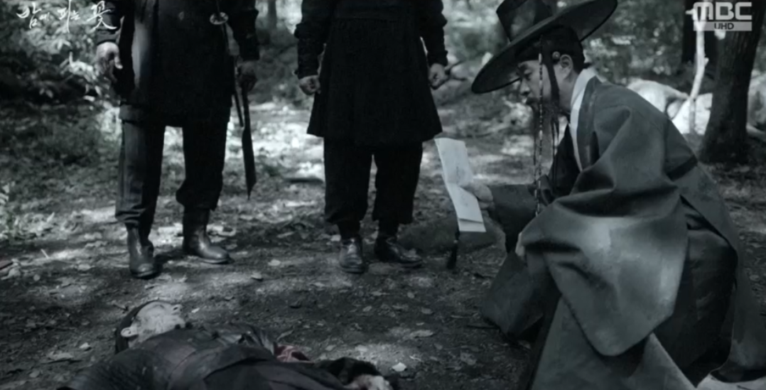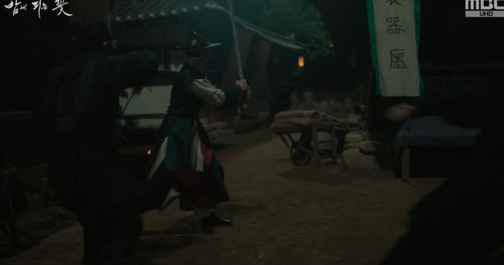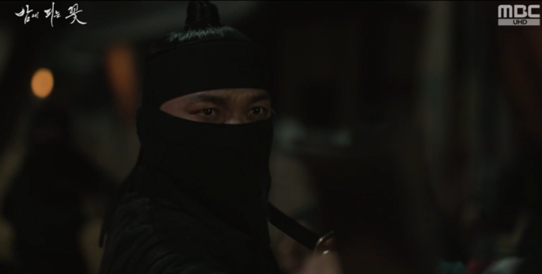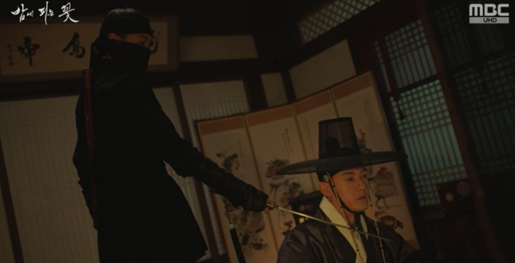 강필직의 칼을 본 수호는 15년전 강필직의 칼에 등을 다쳤던 기억이 떠올라 잠시 혼미해 지고 그 틈을 타 강필직은 수호 등에 있는 상처를 확인하고는 수호가 15년전 내금위장의 아들임을 확신하게 됩니다. 마침 수호가 위험해진 순간 여화가 나타나 강필직과 맞서서 다친 수호를 구해줍니다.