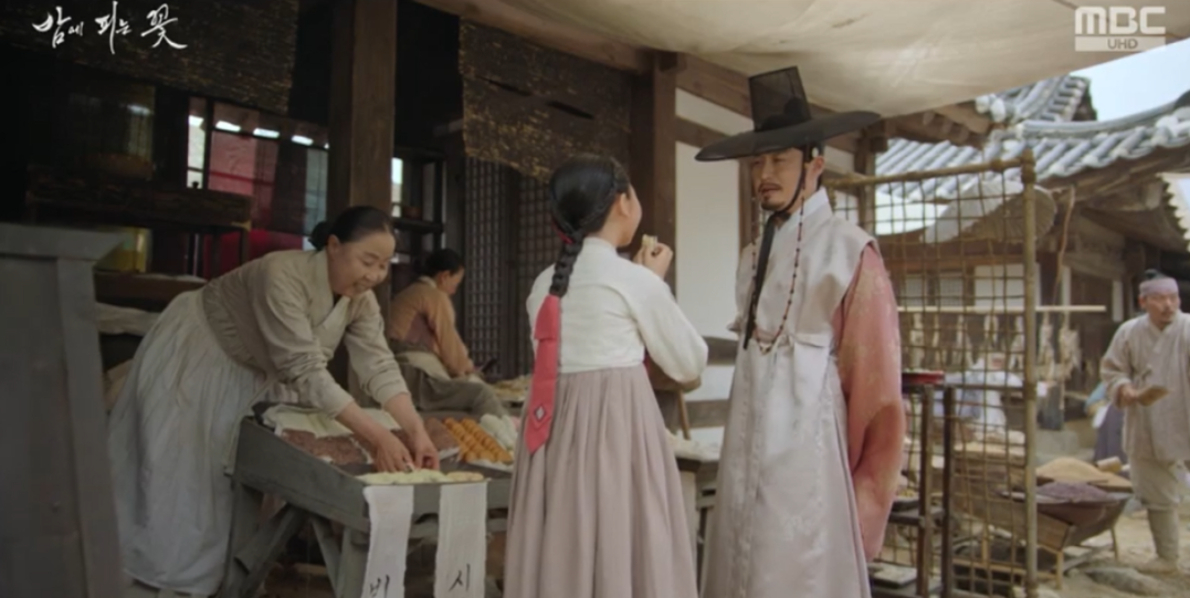 그 시각 저잣거리에서 명도각 선배인 꽃님이에게 뇌물로 점미병 ( 점미병 뜻:  粘米餠 ,대추, 밤, 말린 감이 들어가고 녹두고물을 한 찰시루떡) 을 사주던 요섭은 점미병을 좋아하던 자신의 어머니 유금옥을 떠올리는데 마침 우울한 마음을 달래려 외출나온 어머니를 마주칩니다.