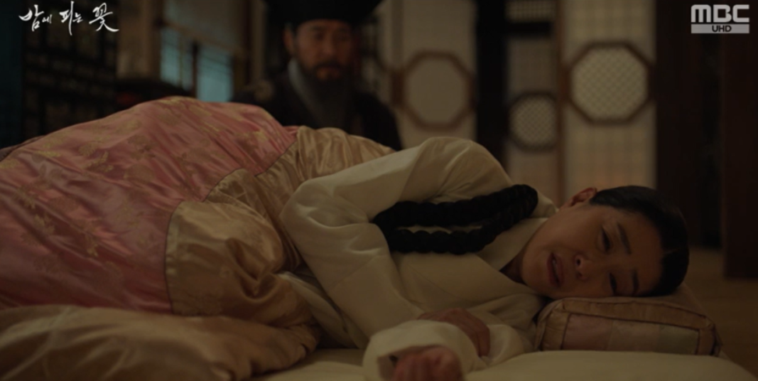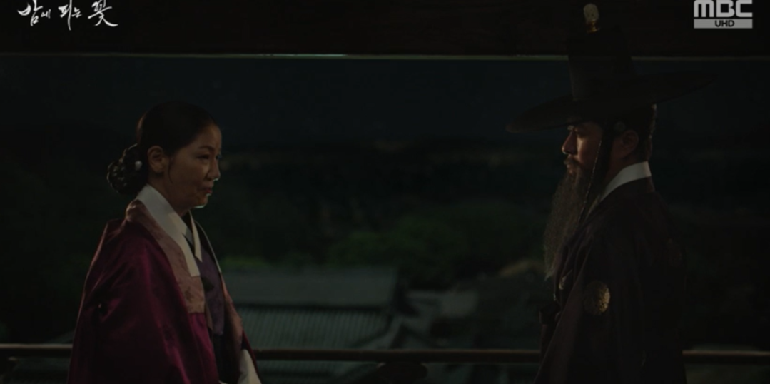 임금은 장번내시를 통해 15년전 선왕이 돌아가시던 날 차를 올린게 호판부인 이였다는 사실을 알아내고 윤학에게 이야기 합니다. 임금은 어마마마 곁에 있으면서 그림자같이 있었다고 떠올리는데 윤학은 15년전 대비가 중궁시절일때도 중궁전을 자유롭게 드나들었던 것을 보면 그때부터 좌상과 연이 있었을 거 같다 이야기 합니다.