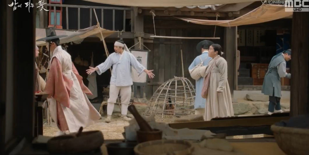 어머니와 봉말댁을 피해 급하게 명도각을 돌아온 요섭과 오라버니에 대한 소식을 듣고 급히 대행수를 찾아온 여화. 마침 여화가 다른 사람에게 밀려 넘어지려는 것을 붙자아 주려다가 여화의 머리가 요섭으 갓끈에 끼는 해프닝이 일어납니다.