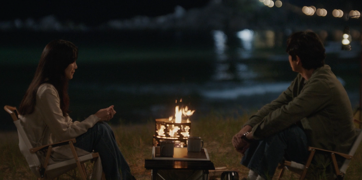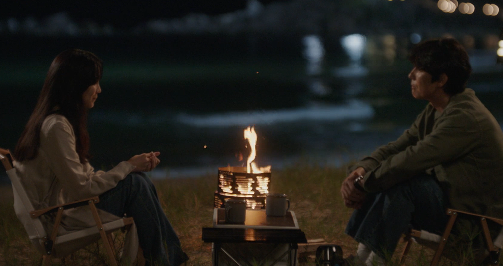 함께 밤바다를 바라보며 차를 마시는 두사람.
