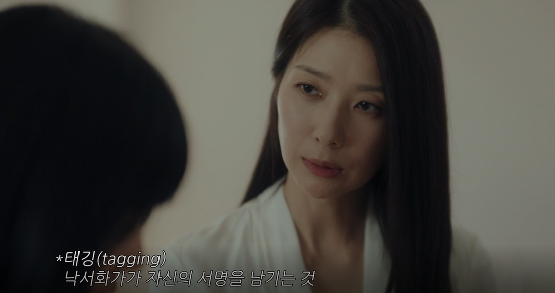 서경은 직원에게 DINO 라고 태깅을 남기는 벽화 작가를 찾아달라고 부탁하는데, 보니 진우의 그림.서경은 아직 진우작품인지 모르고 있습니다.
