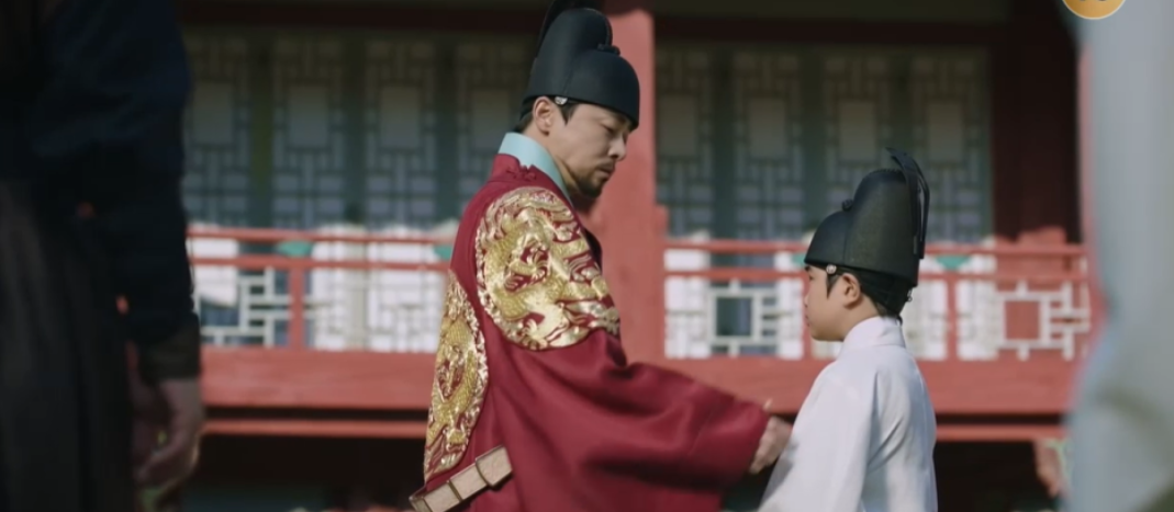 세자를 보겠다고 하는데 마침 왕대비전 문후를 가있는 세자. 임금도 왕대비전으로 오는데 문후를 올리러 왔다가 들어가지 못하고 밖에서 기다리고 있는 세자를 보고는 함께 데리고 들어갑니다.