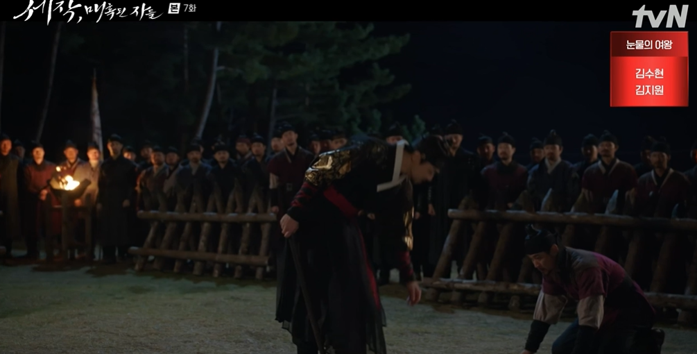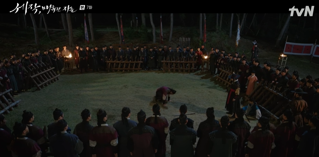 상처입은 상대를 살펴주면서 군병들에게 훈련의 의미는 약소한 동료를 놀리고 공격하라는 것이 아니라 지켜주라는 의미라며 가르침을 주는 임금.