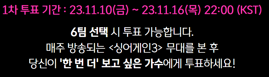 싱어게인3 기본정보 채널: JTBC 방송시간: 목요일밤 22:00- 방송기간: 23년 10월 26일부터 - 오디션 진행방식: 1라운드 조별생존전 →(대국민온라인투표) → 2라운드 팀대항전 → 3라운드 라이벌전 → 4