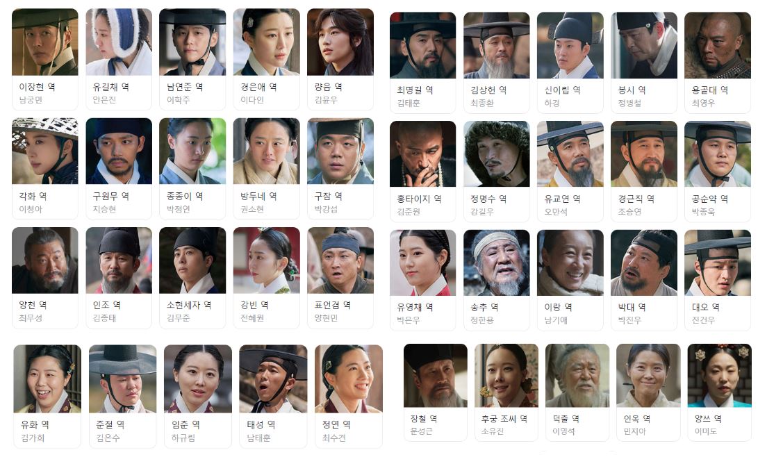 이장현 (남궁민), 유길채 (안은진), 남연준 (이학주), 경은애 (이다인), 량음 (김윤우), 구원무 (지승현), 종종이 (박정연), 방두네 (권소현), 구잠 (박강섭), 양천 (최무성), 인조 (김종태), 소현세자 (김무준), 강빈 (전혜원), 표언겸 (양현민), 최명길 (김태훈), 김상헌 (최종환), 신이립 (하경), 봉시 (정병철), 용골대 (최영우), 홍타이지 (김준원), 정명수 (강길우), 유교연 (오만석), 경근직 (조승연), 송순약 (박종욱), 유영채 (박은우), 송추 (정한용), 이랑 (남기애), 박대 (박진우), 대오 (진건우), 유화 (김가희), 준절 (김은수), 임춘 (하규림), 태성 (남태훈), 정연 (최수견), 장철(문성근), 후궁조씨 (소유진), 덕출(이영석), 인옥(민지아), 양쓰(이미도)