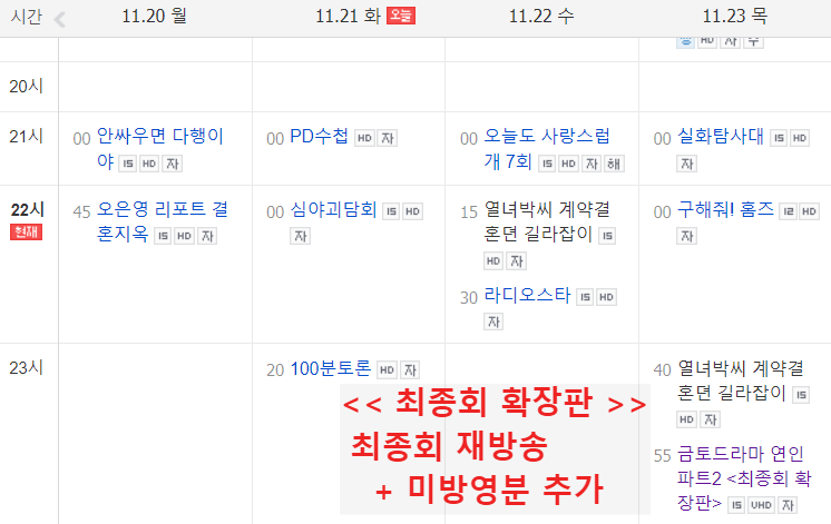 ▶ 11월 23일 목요일 밤 11시 55분부터 110분가량 연인 최종회 확장판이 방영된다고 합니다.