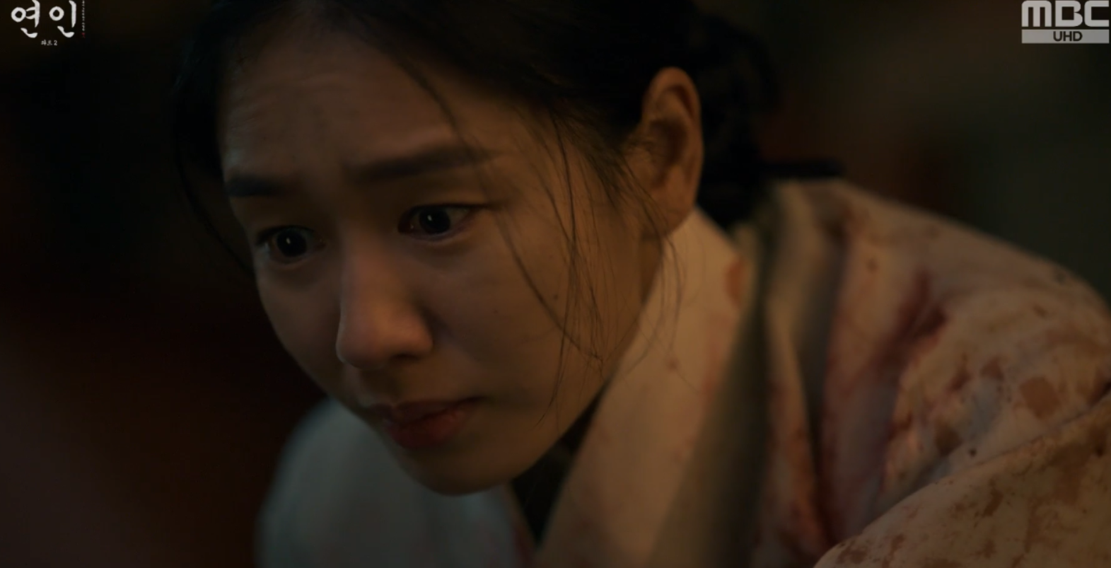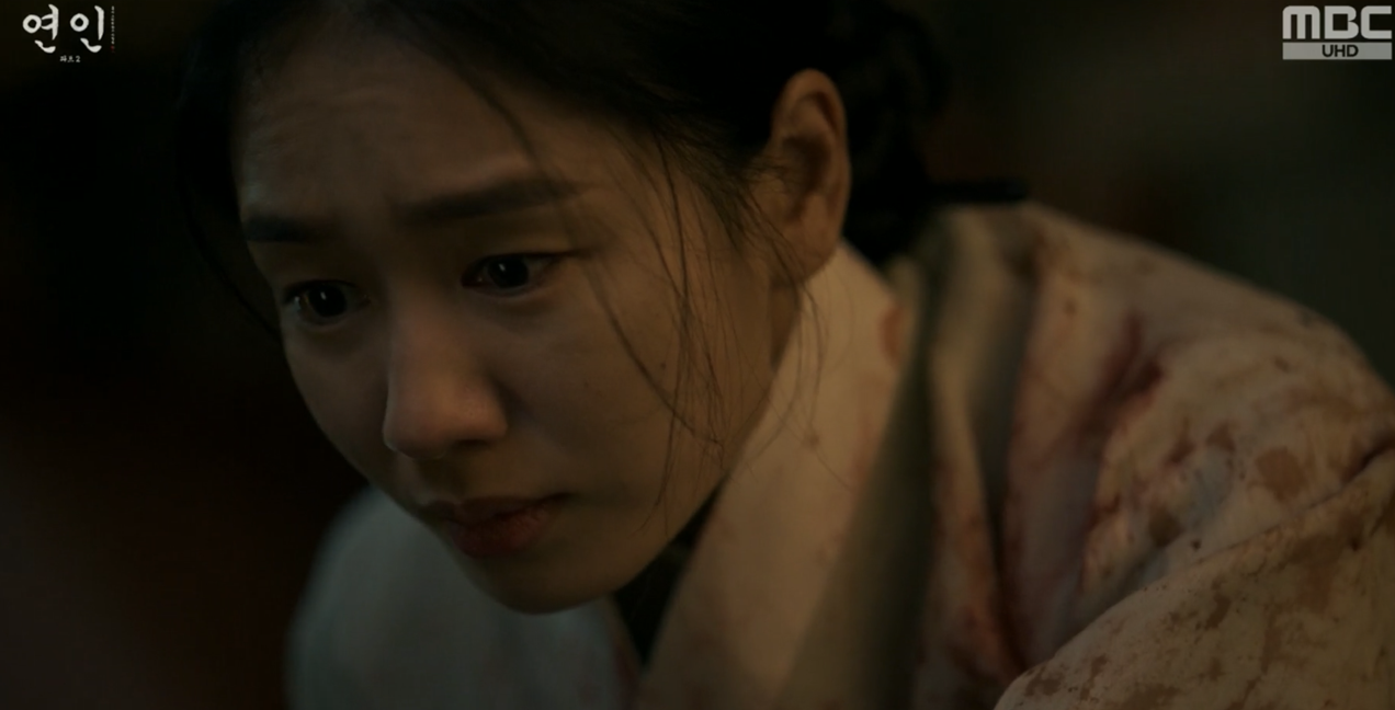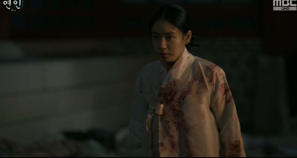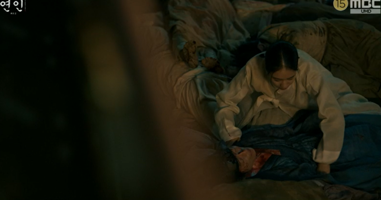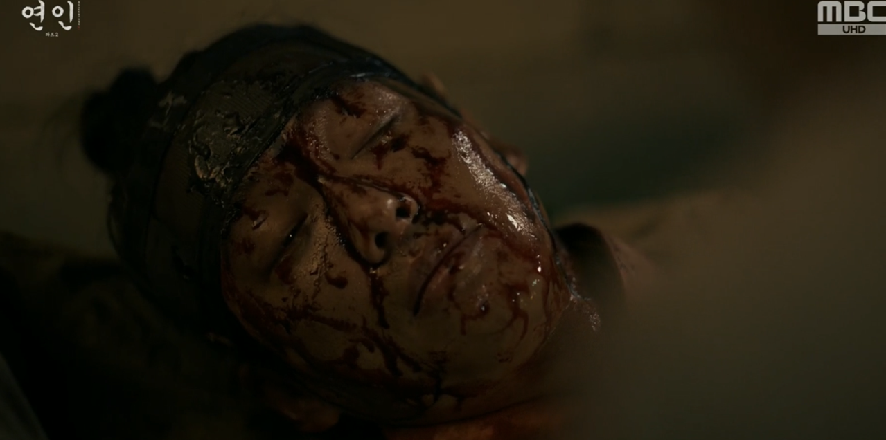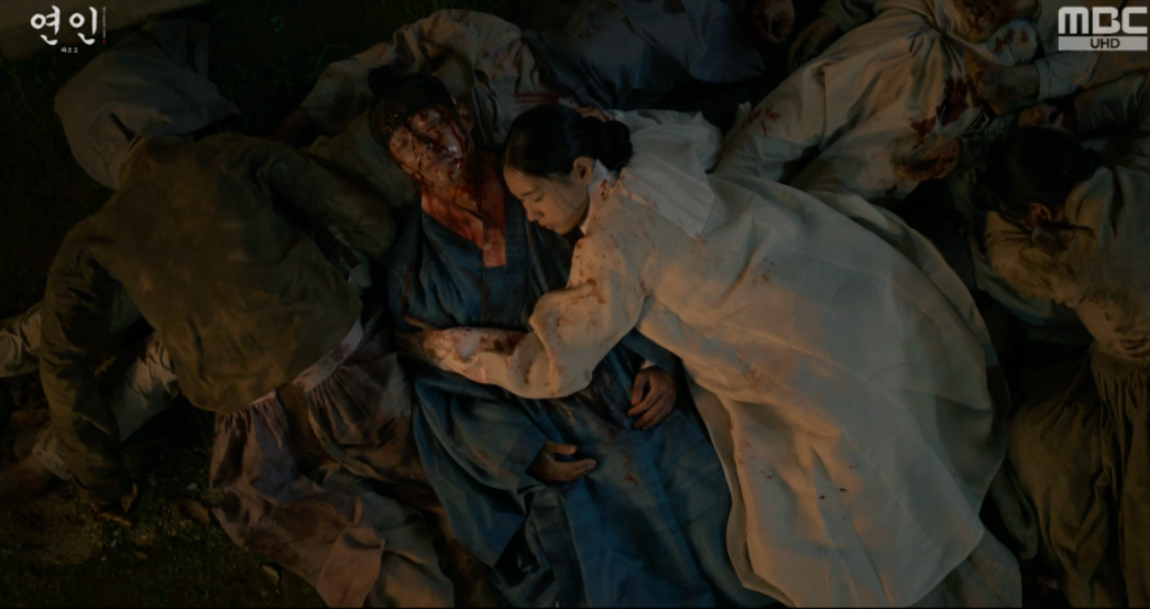 장현을 보고 놀라서 다급히 장현을 깨워보는데 의식을 찾지 못하고 인기척이 느껴지자 길채는 자신의 몸에도 피를 묻혀 자신역시 시체인듯 장현을 끌어안고 곁에 누워 그를 지킵니다.