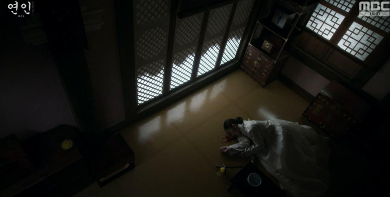 소현세자의 죽음을 전해듣고 임금이 오고 세자빈은 임금이 보낸 의원에게 치료를 받다가 결국 죽게된 세자를 생각하며 내심 원망스런 눈길로 인조를 바라보는데 인조는 그 표정을 괘씸하게 여깁니다.