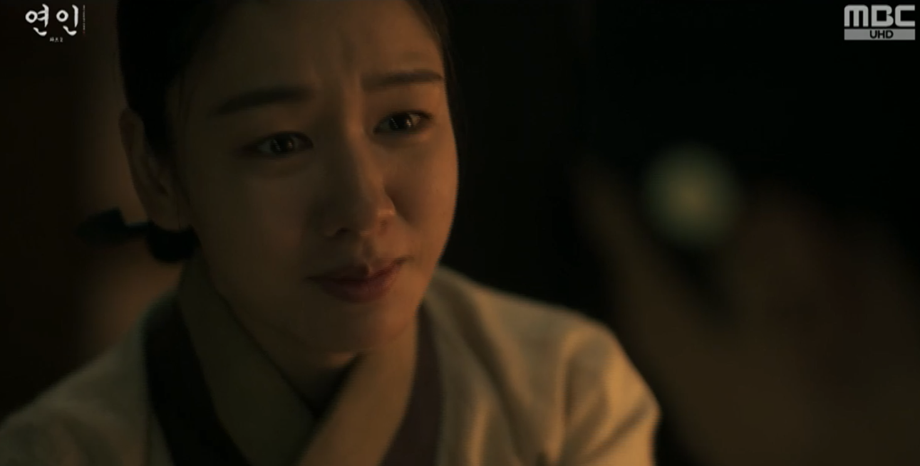 남편의 죽음을 슬퍼하며 울다가 세자가 이장현에게 남긴 마지막 편지를 발견한 세자빈은 길채에게 사람을 보냅니다. 나인은 넌지시 이장현의 소식을 묻지만 길채는 장현이 잡혀갈 것을 경계하여 만난적도 없다고 합니다. 하지만 나인은 세자빈께서 길채가 이혼당하고 어렵게 살고 있는 것을 염려하여 원손을 구해준 고마움을 갚고자 패물을 보냈다며 간직하라고 물건을 건내주고 갑니다.