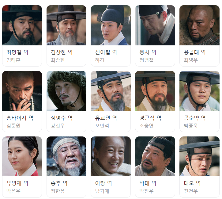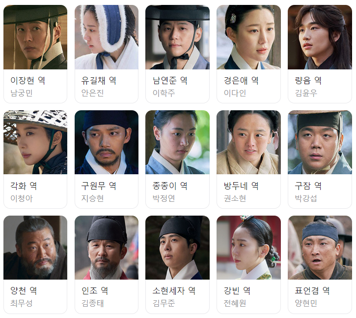 이장현 (남궁민), 유길채 (안은진), 남연준 (이학주), 경은애 (이다인), 량음 (김윤우), 구원무 (지승현), 종종이 (박정연), 방두네 (권소현), 구잠 (박강섭), 양천 (최무성), 인조 (김종태), 소현세자 (김무준), 강빈 (전혜원), 표언겸 (양현민), 최명길 (김태훈), 김상헌 (최종환), 신이립 (하경), 봉시 (정병철), 용골대 (최영우), 홍타이지 (김준원), 정명수 (강길우), 유교연 (오만석), 경근직 (조승연), 송순약 (박종욱), 유영채 (박은우), 송추 (정한용), 이랑 (남기애), 박대 (박진우), 대오 (진건우), 유화 (김가희), 준절 (김은수), 임춘 (하규림), 태성 (남태훈), 정연 (최수견) 등