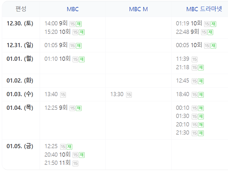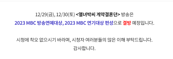12/29(금), 12/30(토) <열녀박씨 계약결혼뎐> 방송은  2023 MBC 방송연예대상, 2023 MBC 연기대상 편성으로 결방 예정이라고 합니다. 시청에 착오 없으시기 바랍니다.