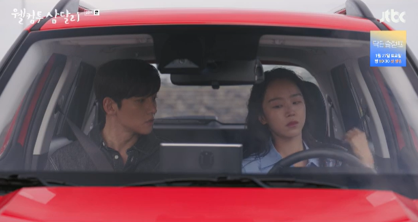 사진작가 보조스텝 직원이 된 용필은 삼달의 거부에도 불구하고 함께 촬영을 다니기 위해 간식거리까지 잔뜩 챙겨서 촬영용 차에 몰래 탑승합니다.