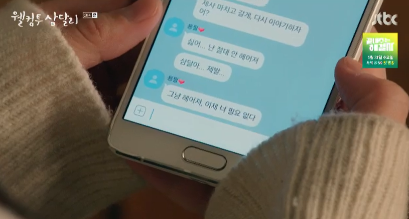 하지만 삼달역시 용필이 싫어서 헤어지자고 했던 것이 아니였기때문에 결국 용필없으면 안되겠다며 용필의 집앞에 와서 울면서 매달리지만 용필은 방에서 숨죽여 울면서 헤어지나는 카톡을 보냈던 것이였습니다.
