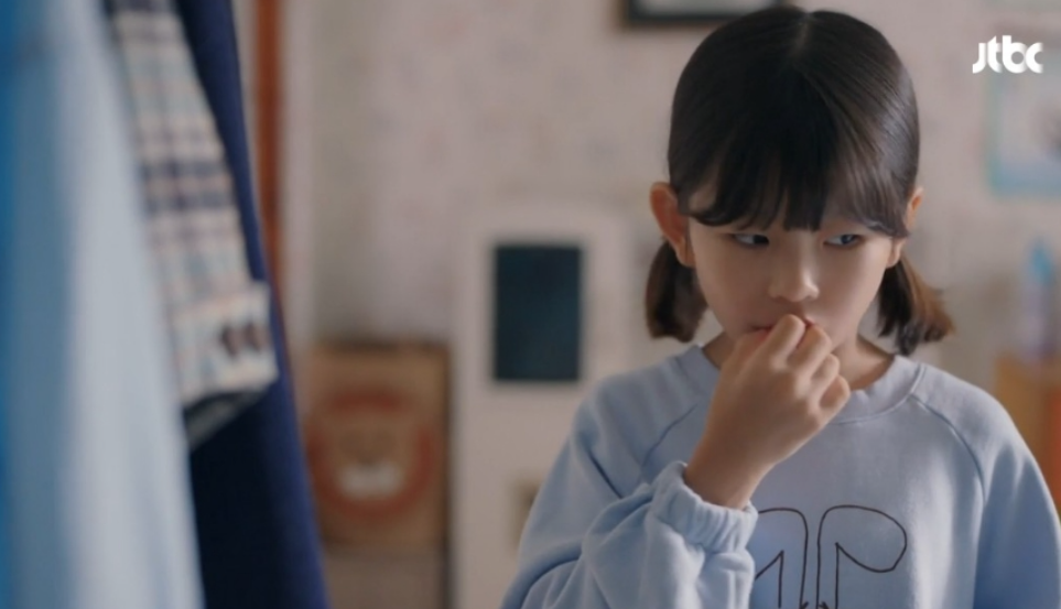 방에서 숨죽여 소리를 듣고 있는 귀여운 하율이 할머니를 위하는 마음에서 잠수복을 숨긴 상황입니다.