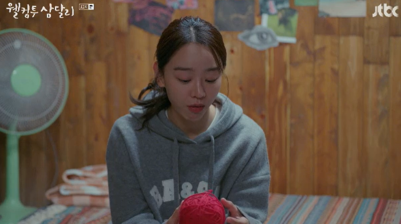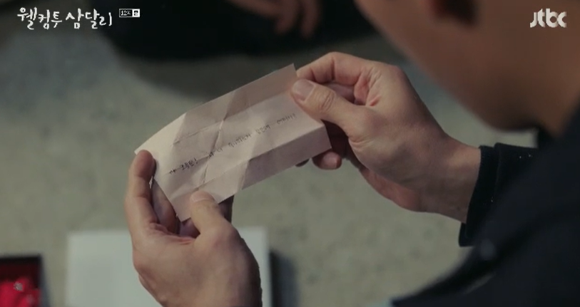 그시각 용필은 그동안 애지중지 해왔던 빨간 털실을 보고도 삼달이 못알아보자 실을 다 풀러 보라고 합니다. 다 풀려면 2시간쯤 걸린다며 장난스럽게 말하는 용필. 다 풀고나니 안에서 하얀 쪽지가 나옵니다. 그건 다름아닌 두 사람이 처음 사귀기 시작할때 삼달이 고백이 담긴 쪽지. 그리고 털실의 정체는 그때 함께 주었던 빨간 목도리.