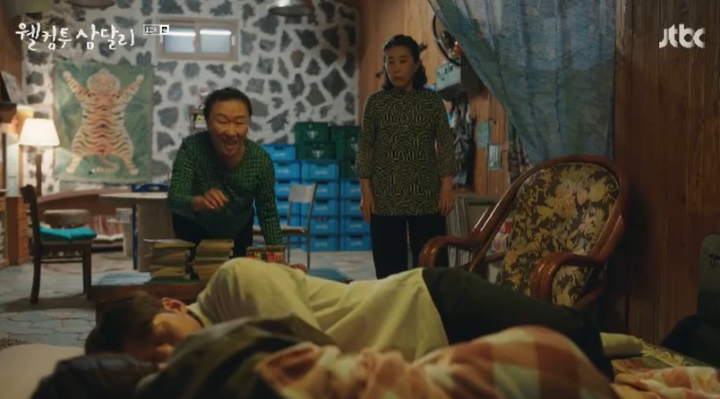 삼달이 늦게까지 안들어오자 찾아나선 고미자. 아지트에 불이 켜진것을 보고 독수리들 아직도 술마시나 보다 하며 들어와서 삼달과 용필이 함께 잠든것을 보게 됩니다.