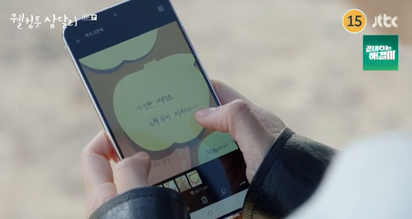 그 시각 삼달은 서울에 있는 어시들로부터 자료를 받고 지난 자신의 전시회때 방명록에 남겨준 사람들의 응원글 사진을 받아보게 됩니다. 사진을 하나씩 살펴보던 삼달은 자신도 모르는 전시회를 찾아와서서 방명록에 남겨준 용필의 글들을 발견하게 되고 옛날 연애 시절 추억과 함께 헤어졌던 8년 동안에도 한결같이 자신을 사랑해줬던 용필의 진심을 깨닫게 됩니다.