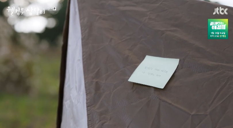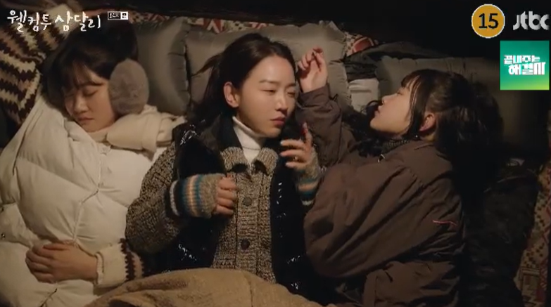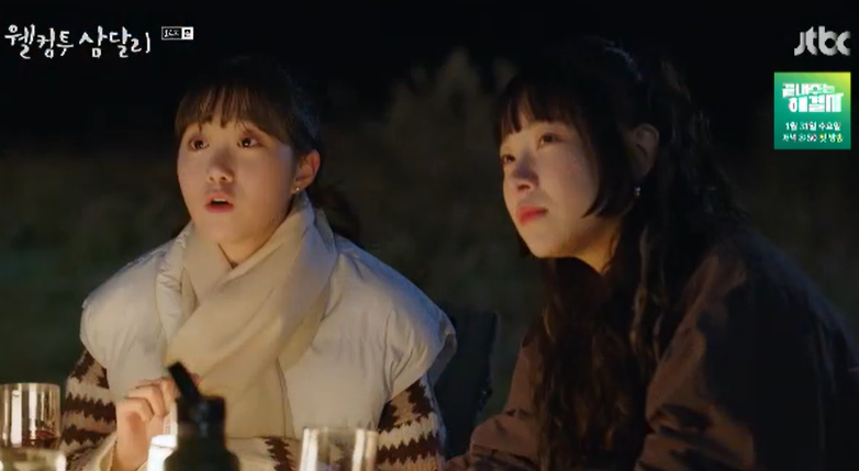 어시들이 눈치가 없긴 한데 그래도 삼달을 좋아하고 따르는 마음은 진심같다는 용필. 삼들은 둘이서 오붓한 시간을 보내지 못해 시무룩한 용필에게 다음엔 꼭 어시들 떨구고 둘이서 함께 캠핑을 가자며 용필의 서운한 마음을 달래줍니다.