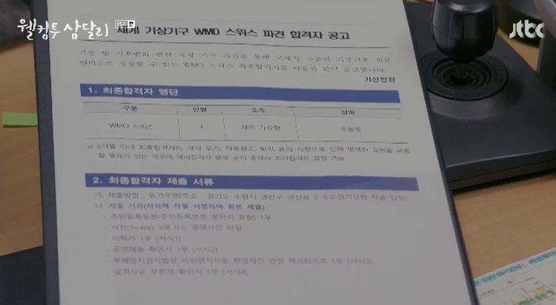 기상청과장님이 용필대신 지원한 세계 기상기구 스위스 파견자로 합격한 용필. 과장님은 자랑스럽게 출근한 용필에게 합격 공고를 보여주는데 용필은 안간다며 시큰둥하게 굴면서 온통 삼달의 전시회에만 관심이 있습니다.