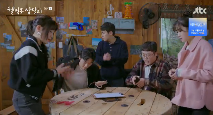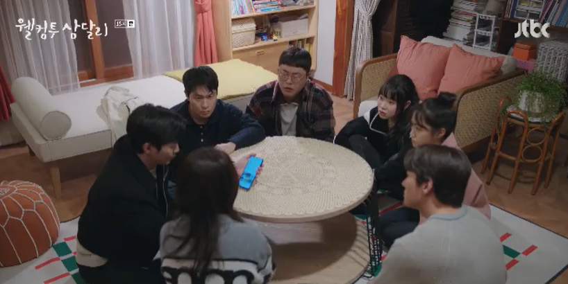 친구들은 삼달을 돕기 위해 모여서 대책회의를 하는데 마침 삼달의 어시들이 길을 지니가다가 회의에 합류하게 됩니다. 그 와중에 삼달의 어시인 은비에게 반한 경태는 혼자 멋있는 척 폼을 잡고 앉아 있습니다.