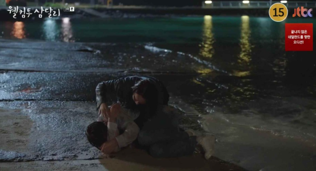삼달이 서서 물을 들여다 보는 것을 자살하려고 한다고 오해한 조용필은 삼달을 잡으려다 무게중심을 잃고 빠지고 결국 수영도 못하는 용필을 삼달이 건져냅니다.