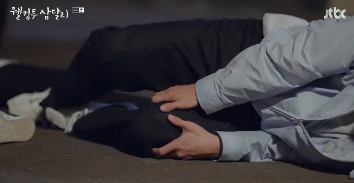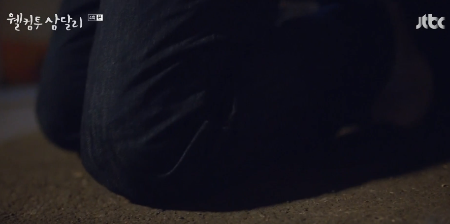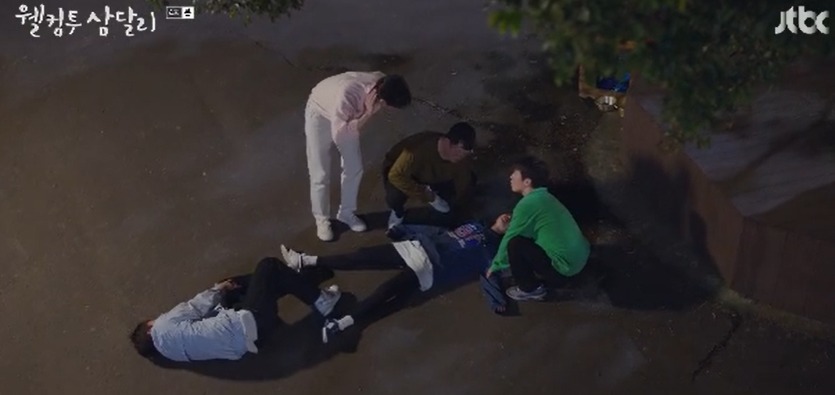전날 회상. 만취로 뻗어버린 삼달을 옮기는데 힘에 부친 친구들. 결국 용필이 집이 같은 방향이니 업어서 옮기겠다고 하는데, 용필 등에서 삼달이 난리를 치는 바람에 삼달은 떨어지고 용필도 무릎을 땅에 부딪혀 다친 상황.