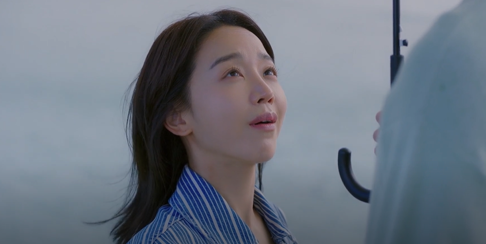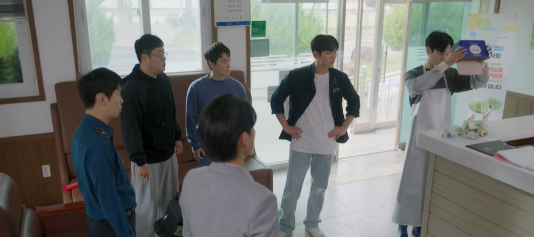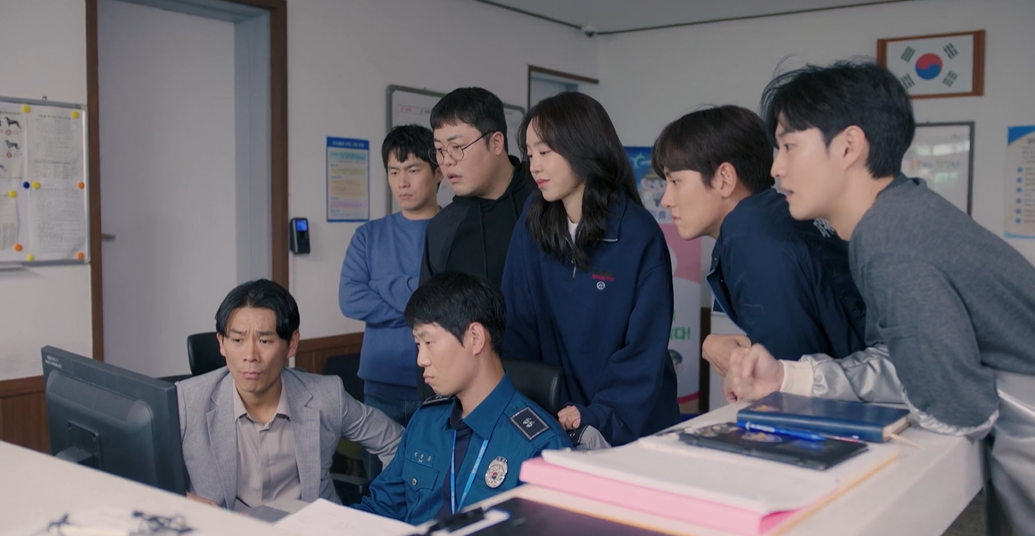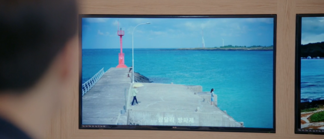 다음날 청장님 참석 회의를 총괄하게 된 용필. 다른 사람들과 달리 혼자 제주에 비가 올거라고 주장하는 하는데 진짜로 회의중에 비가 내리기 시작합니다. 용필은 관측용 CCTV를 통해서 비 내리기 시작한 방파제에 혼자 있는 삼달을 발견하고는 우산을 갖다주려고 일어섭니다.