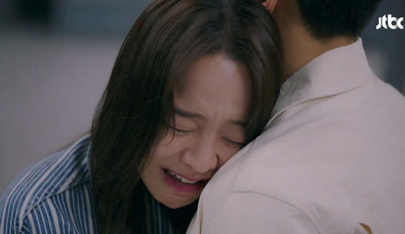 용필은 삼달을 사무실에서 나오고 삼달은 용필에게 기대어 한참을 웁니다.