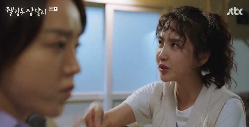 혼자 앉아 있는 삼달을 발견한 용필은 다가가 괜찮냐고 묻고, 삼달은 감정이 폭발에 용필에게 묻습니다.